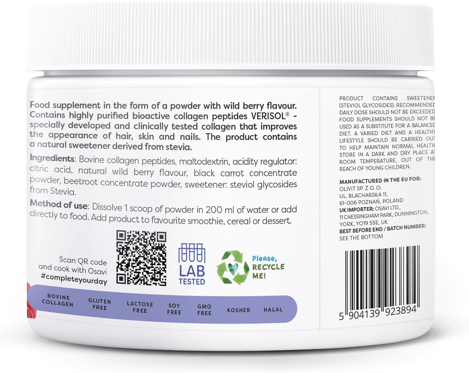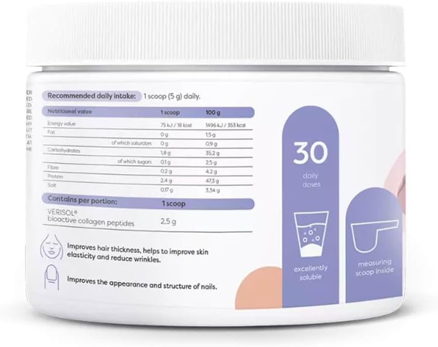 Complément alimentaire sous forme de poudre contenant des peptides de collagène bioactifs VERISOL hautement purifiés – un collagène spécialement développé et cliniquement testé pour améliorer l’apparence des cheveux, de la peau et des ongles.